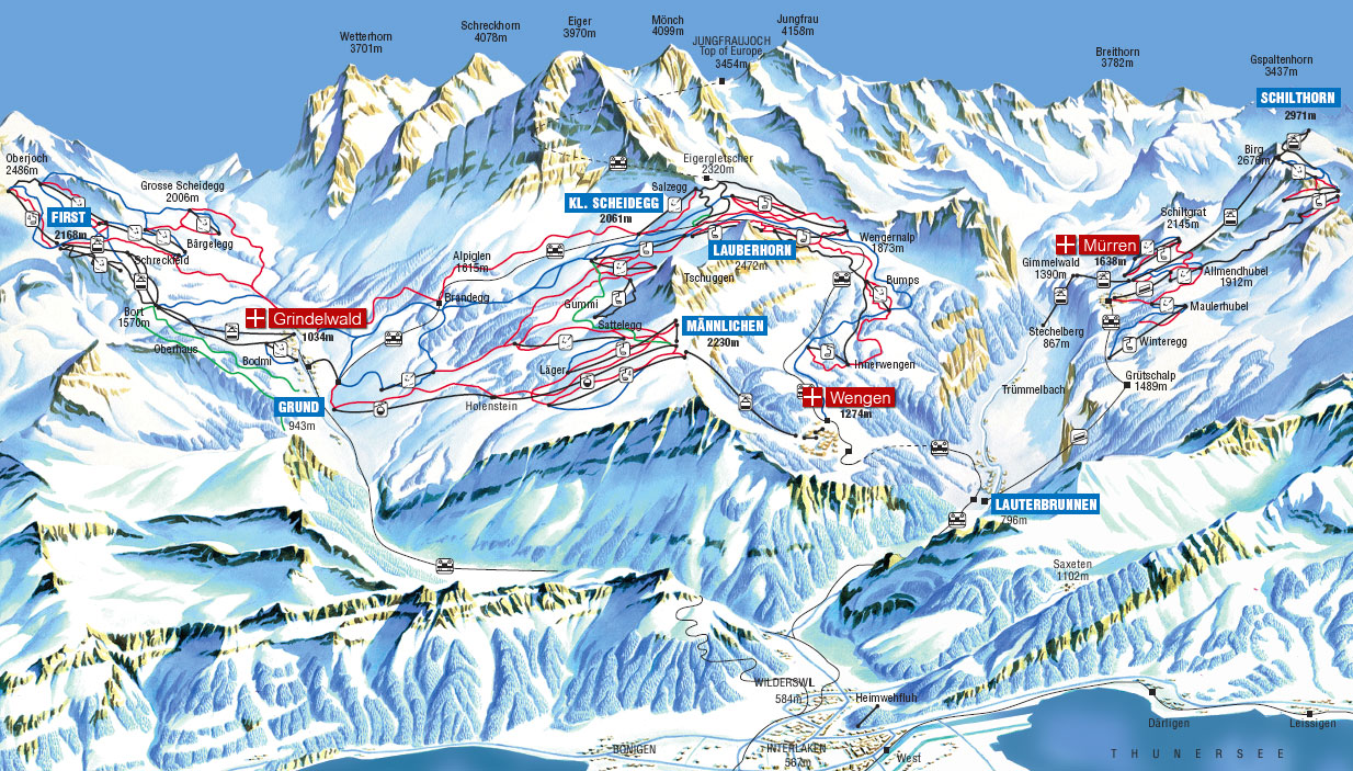 02037780123Ski holidays in Murren are perfect for beginner and intermediate skiers but Murren also caters well for advanced skiers alike. It is located with the Jungfrau Region with 214km of piste of which the majority are blue and red runs, perfect for intermediates. However, there are a few blacks thrown into the mix as well for the advanced skiers amongst your party. For the beginners the blue runs that are on offer are very easily accessed from the resort without having to get a big lift up to the nursery slopes. Of the three resorts that make up the area (Murren, Wengen and Grindelwald), Murren has the highest skiing on offer and for those looking for a really challenge some of the hardest runs that are in the area are located in Murren as well.